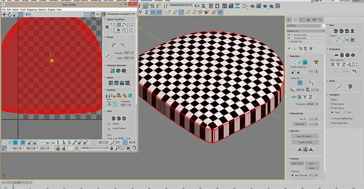 Релаксом поправить можно. А какого резальтата Вы хотите добиться? Идеально ровного чеккера не получится, как не крути, но при натягивании на изогнутую поверхность будут искажения. Даже если взять, к примеру, лоскут ткани в клетку и натянуть ее на мяч, получится примерно то же самое. Текущая ЮВ вполне рабочая.