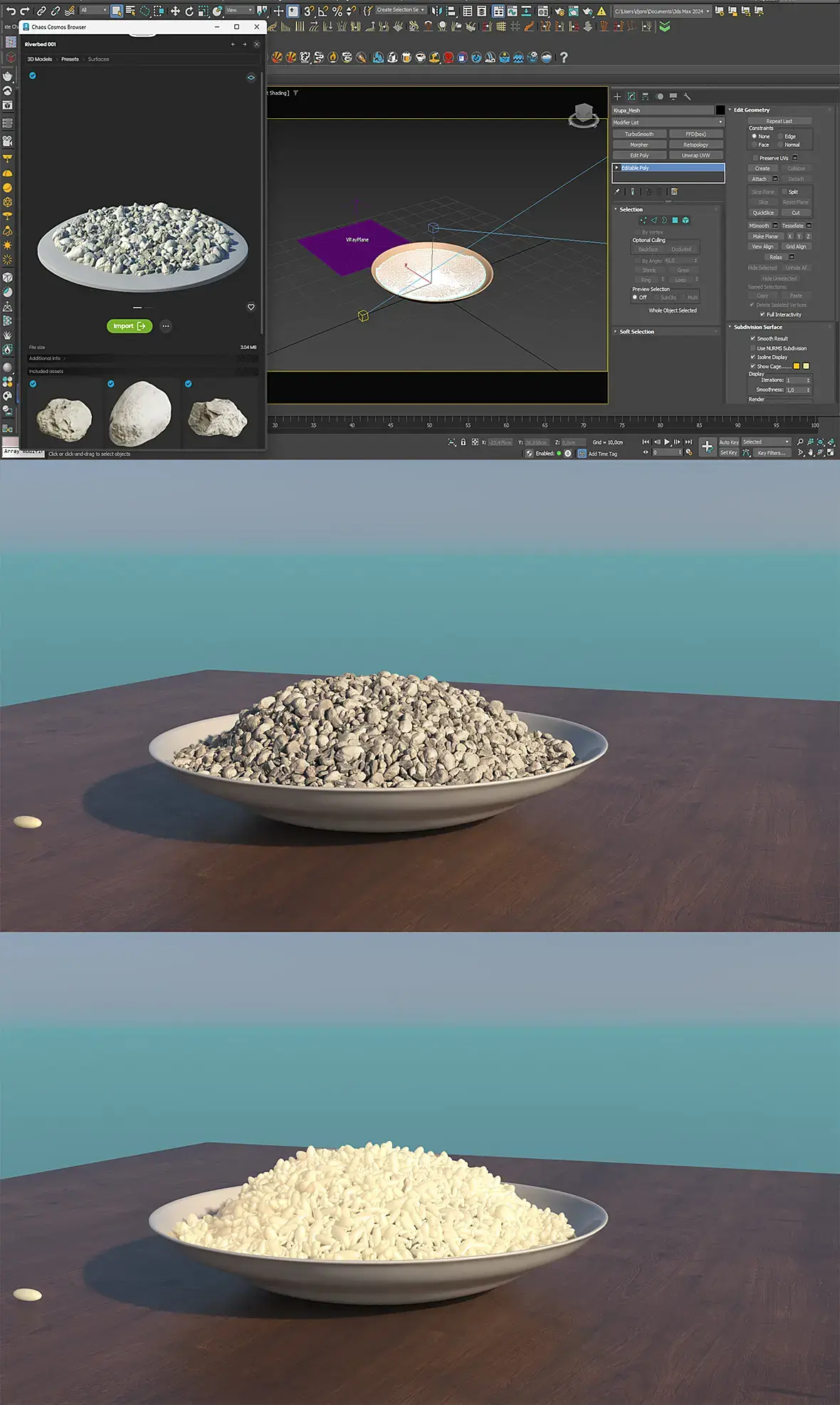 В Chaos Cosmos Browser Scatter trees for - Бесплатная альтернатива ITOO Forest Pack, там есть готовые пресеты, кусты, деревья, трава, камни. Наполняешь тарелку камнями, настраиваешь по размеру, количеству и тд.., потом в настройках Riverbed все камни удаляешь, моделируешь отдельно рисинку, и добавляешь её вместо камней, и вот тебе тарелка с рисом
