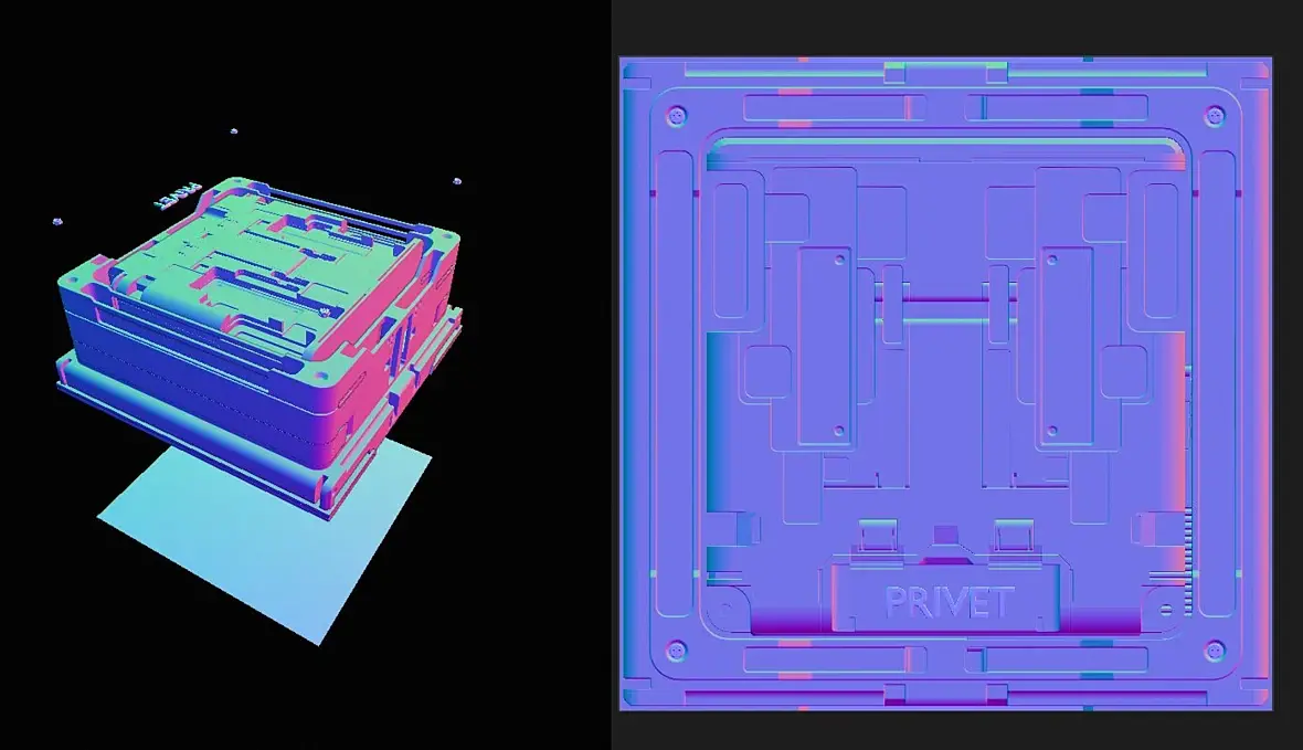 Можно прям с вьюпорта, из ортограф камеры с топ ропекции "забирать" карту нормалей текста, какой либо геометрии, всех и вся, накинув маткап нормалей. Можно отрендерить в квадратную текстуру хардварным квиксильвер рендером.