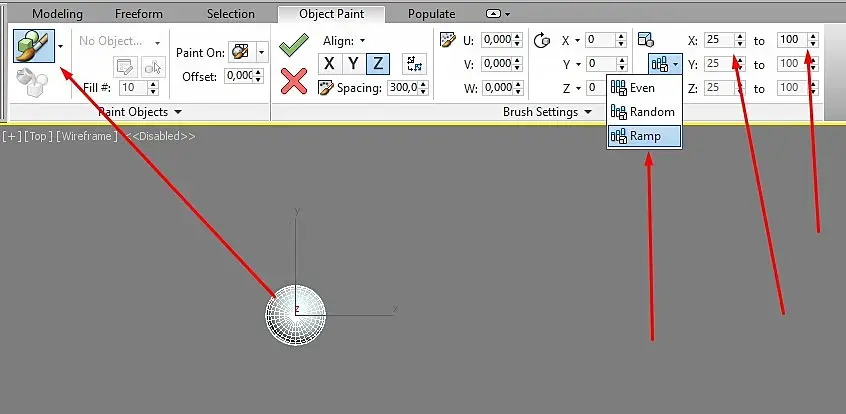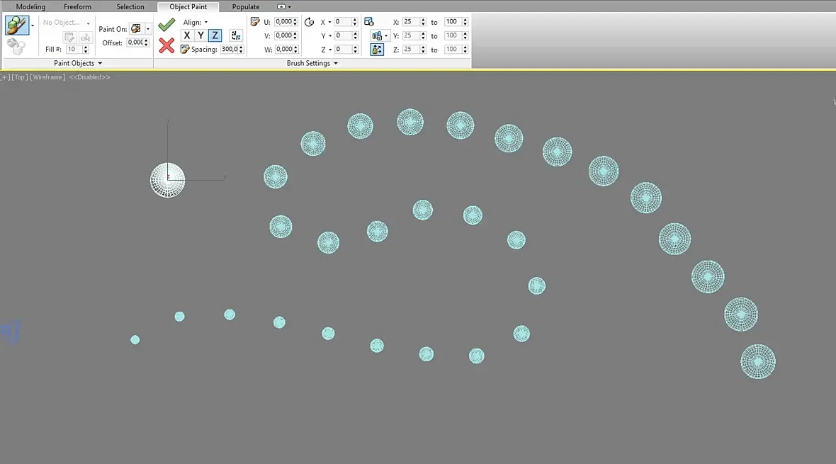 Есть линия прямая или изогнутая, неважно. Есть шарик диаметром 25 мм в начале линии. И этот шарик нужно расклонировать по линии так, чтобы в конце линии его диаметр был, например, 10 мм. То есть его диаметр должен постепенно с каждым шариком уменьшаться с шагом по кол-ву шариков.