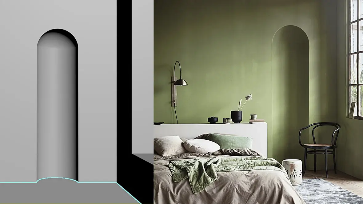 Здравствуйте! Как сделать такую же нишу со сглаженными углами (как на фото)? Делаю Буленом сферы из бокса - вроде неплохо (на фото слева), но острые углы арки потом никак не сглаживаются. Чамфер и турбосмус дают кривые результаты