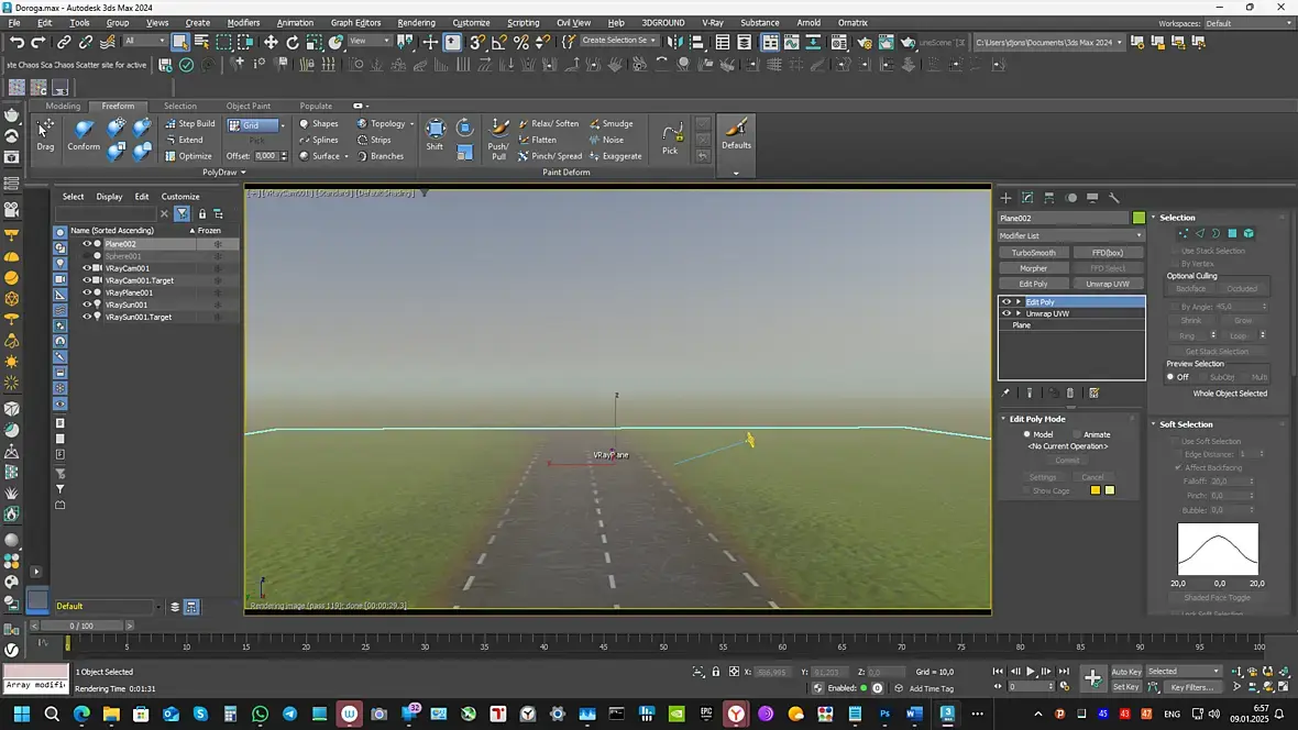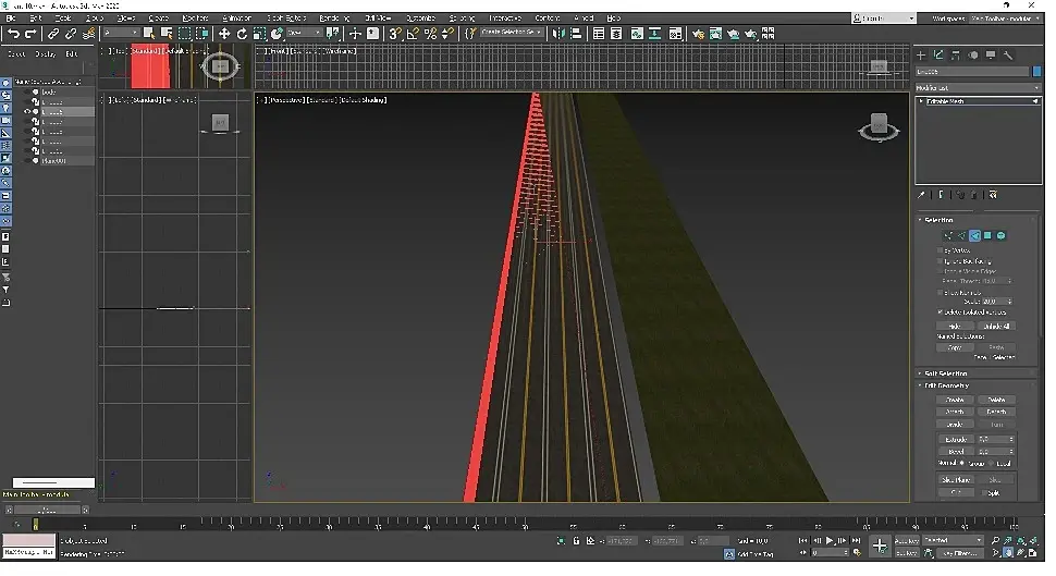 Проще текстуру дороги в фотошопе нарисовать, в максе на Plane наложить UV- развёртку, карты Normal, Displacement (на каком нибудь сайте Free) и не надо мучиться со всякими линиями, сплайнами, да и ресурсы экономятся, под эти карты вообще можно плоскостью с несколькими полигонами обойтись