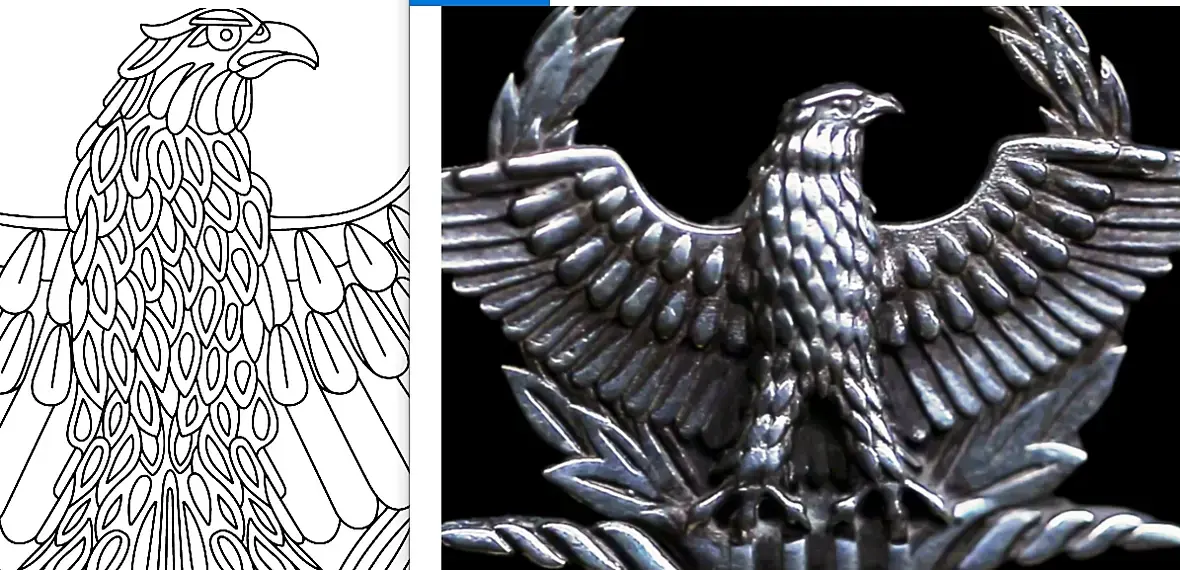 Вот-вот, хочется красивый сглаженный объем, а не просто экструд с фасками (как сейчас). А что имеете в виду под "орла дорисовать"? Есть фотка в разрешении почти 4к - в скрине рядом с контуром. Его надо переделать?