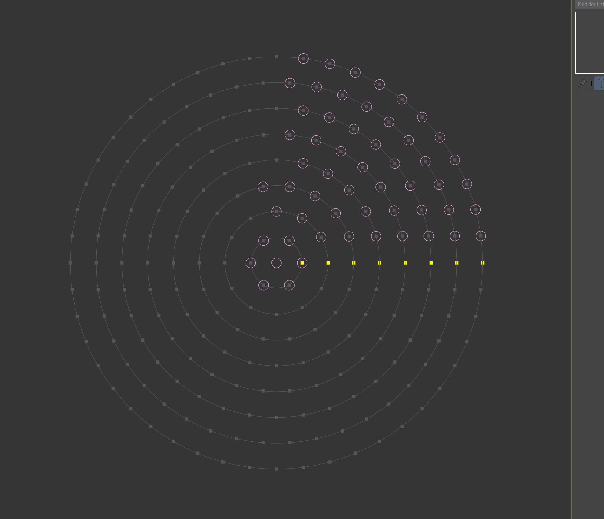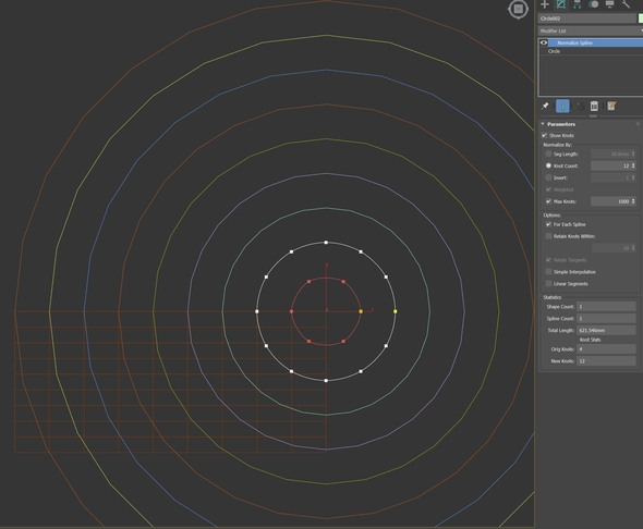 Оно сделано как раз по тому принципу, что ты и описал: создание сплайнов-окружностей, нормализация всех окружностей на заданную длину сегмента (расстояние между точками), и наконец спавн отверстий в точках нормализованного сплайна, просто засунуто всё в один граф В максе есть MCG (Max Creation Graph), возможно там можно сделать что то похожее, но я не знаком с этим инструментом, не могу утверждать