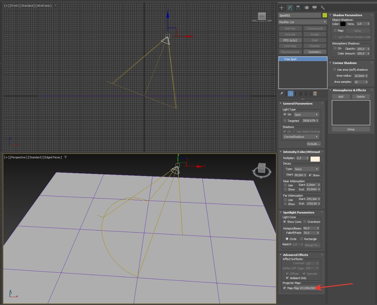 Первое что приходит на ум - использовать Free Spot с текстурой в слоте projector map, но тогда это будет фейковый эффект, если ли способ добиться физ корректного результата?