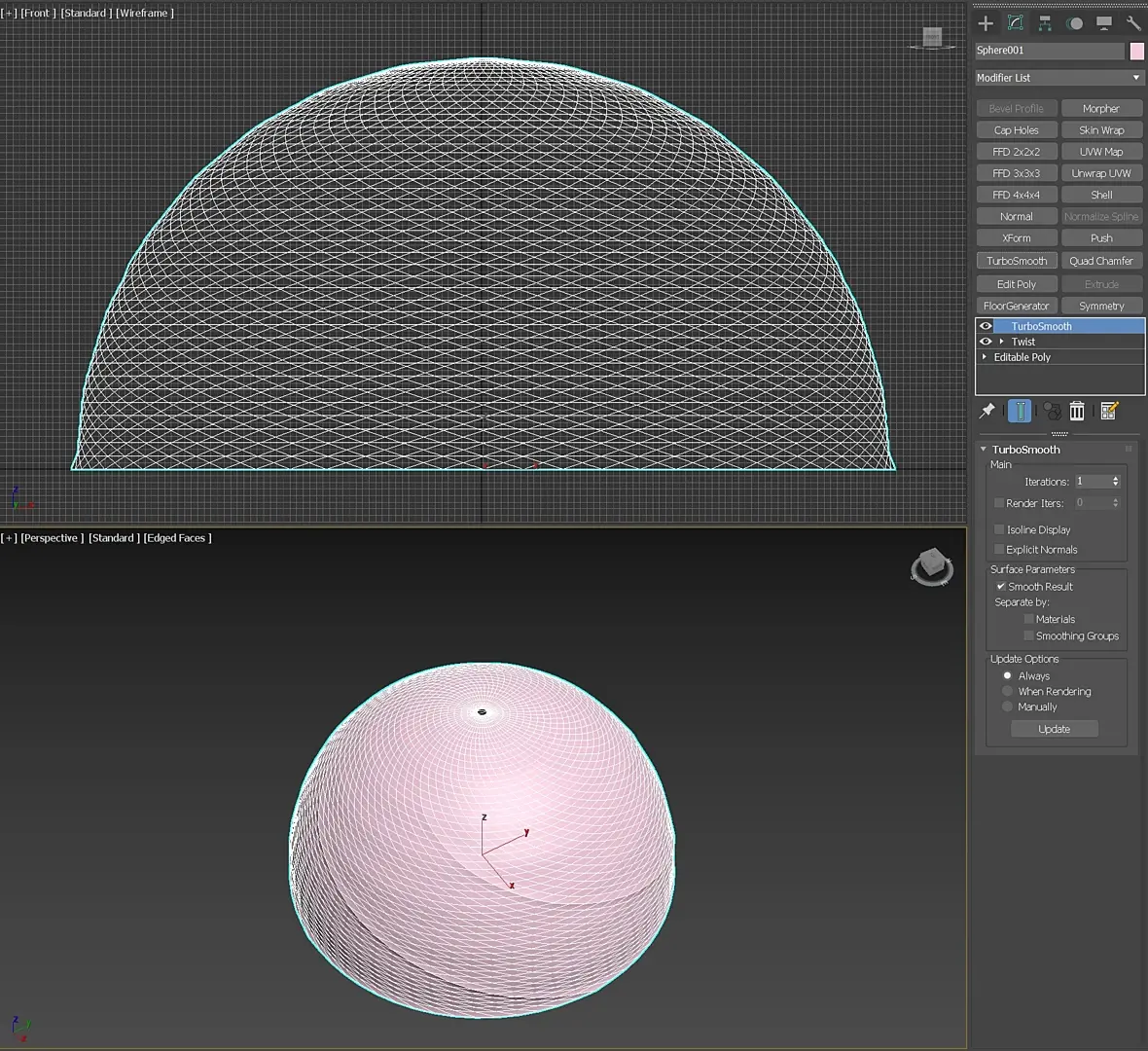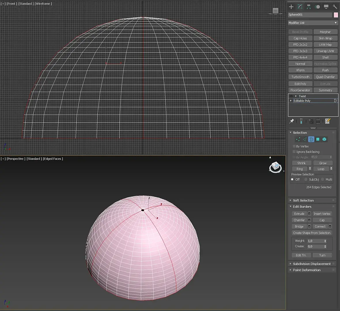 вы руками потом выбирали все нужные полигоны? Я закрутила твистом, потом, чтобы она стала ровнее, сделала турбосмуф, но у меня получилось так много полигонов!)) Руками их, конечно можно выбрать, правда, коряво может получится. Но, по другому, я так понимаю, эти лепестки не выделить...