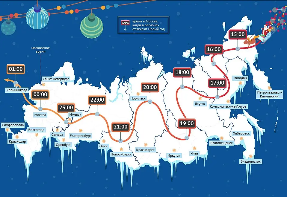 Берешь тазик оливье, раскладываешь по контейнерам, летишь на Чукотку, под куранты начинаешь есть заветный салат, садишься в самолет, летишь на Сахалин, опять ешь, дальше в центральную Якутию или Приморский край, тоже что? - правильно - ешь! И так далее, до Калининграда!