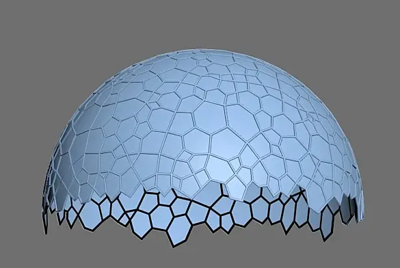 tyflow: Рождение геосферы, разбил вороным, все что ниже 0+-random: delete. Рандомизация материала из ID кластеров. Потом уже с этим мешем работал вручную: Volume select vertex по карте шума, потом twist по Z чтобы сделать неровные края, но не ломать плоскость кусочков. Потом Edit Poly выделение всех контуров элементов >Convert to spline>tySplineMesher, т.к. родной sweep зависает на 2 минуты. Вот тут засада, получается вокруг каждого кусочка замкнутый контур, пересекающийся с соседними.