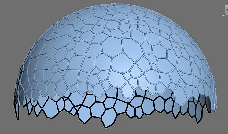 tyflow: Рождение геосферы, разбил вороным, все что ниже 0+-random: delete. Рандомизация материала из ID кластеров. Потом уже с этим мешем работал вручную: Volume select vertex по карте шума, потом twist по Z чтобы сделать неровные края, но не ломать плоскость кусочков. Потом Edit Poly выделение всех контуров элементов >Convert to spline>tySplineMesher, т.к. родной sweep зависает на 2 минуты. Вот тут засада, получается вокруг каждого кусочка замкнутый контур, пересекающийся с соседними.