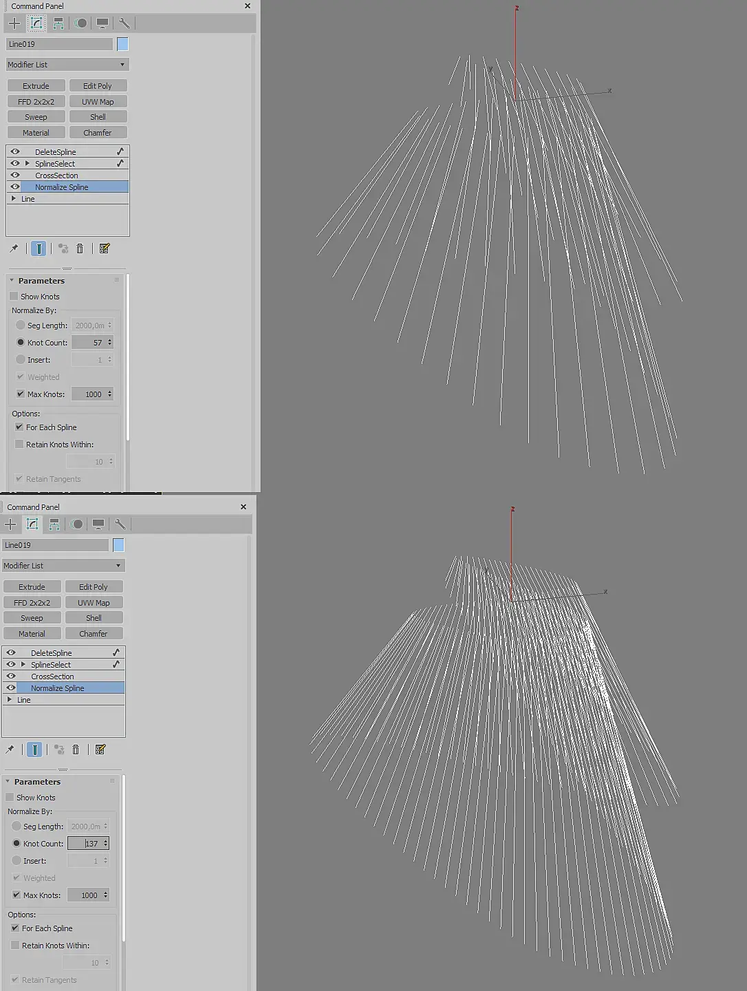 Здесь мы имеем возможность контролировать длину палок на начальном этапе создания с помощью двух сплайнов.