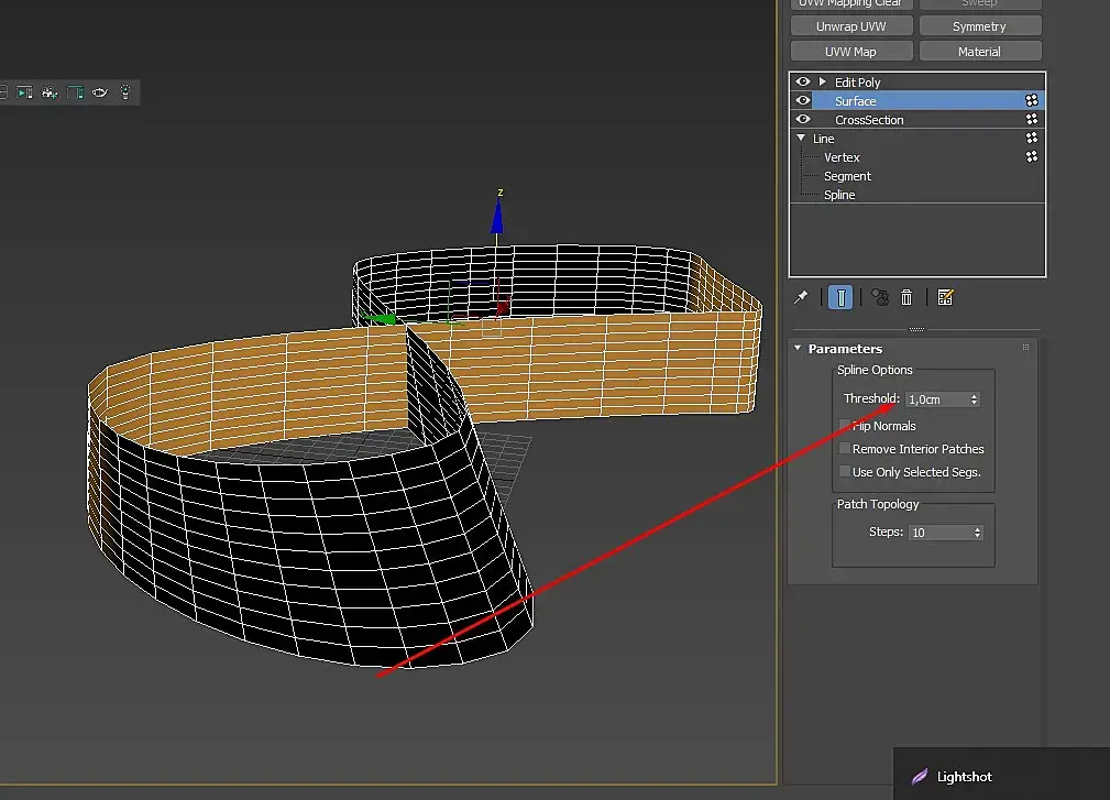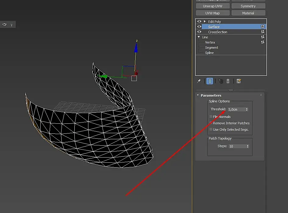 кроссекшон делает ребра между сплайнами, в месте вертексов.. Меш строится сюрфейсом по этим ребрам. Количество ребер можно потом фиксить в самом сюрфейсе, параметр СТЕПС. НО при условии шо сверху эдитполи, шоб видно было. Если СТЕПС равно нулю - ребер будет ровно как точек в изнчальном сплайне.