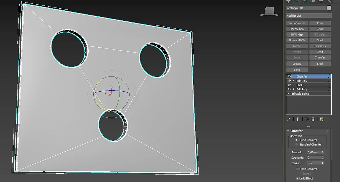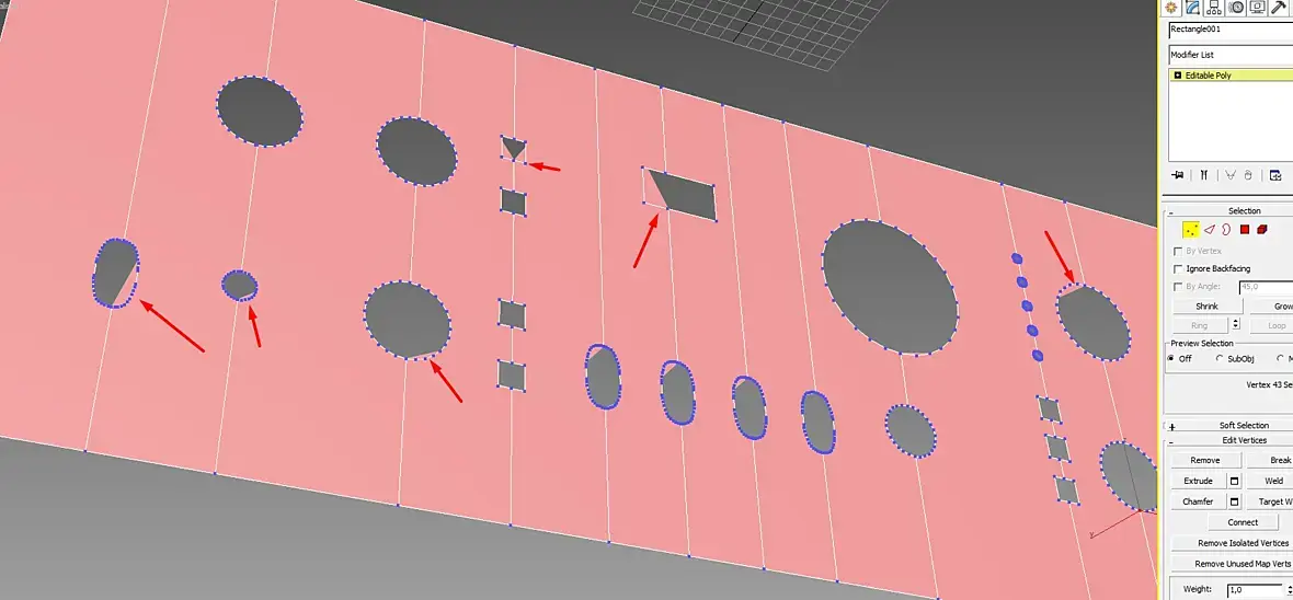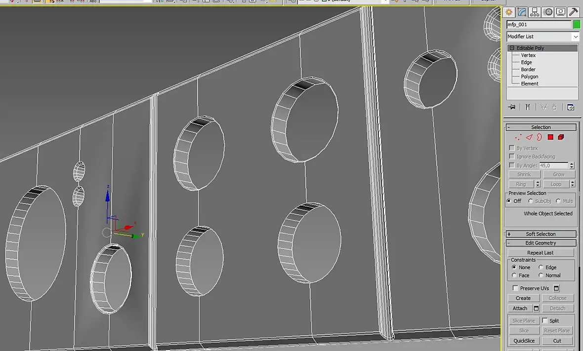 Если строю сплайнами-перевожу в поли-нарезаю слайс плэйном вертикальные полосы,то появляются артефакты на кругах.Если добавить горизонтальные линии слай плэйном,то артефакты изчезают . Но в обоих случаях нармально работоть с фаской не получается .Если же изначально использовать моделинг в поли для создания отверстий,то образуется куча эджей ,которых здесь нет. Вот ссылка на панель в 3ds max 2014https://yadi.sk/d/6ILn8EuSKlaTiQ