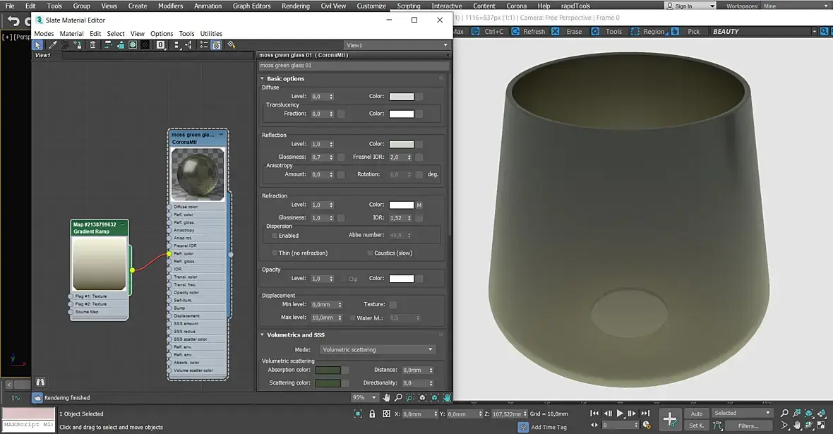 У меня ребристость появляется только при включении волюметрики, как только ее отключаю - все становится нормально. Можете перенести градиент на рефракшн, у вас толщина стекла везде примерно одинаковая, так что на резльтат вряд ли сильно повлияет.