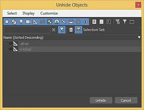 1. Select From Scenes (H), В меню Display - Object Types - Display Hidden Objects.