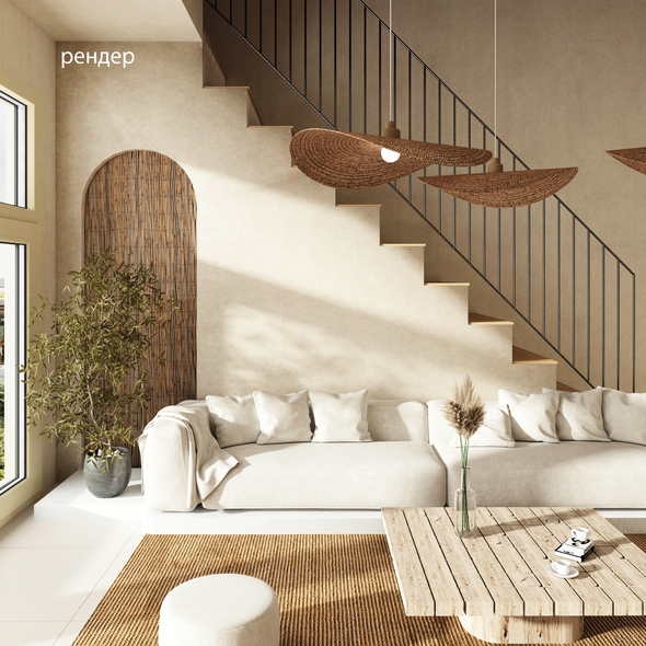 Здравствуйте! Я начинающий визуализатор. Подскажите, пожалуйста, как можно улучшить материал джутового коврика, люстры из джута и арки из бамбуки? И какие есть ошибки в рендере?