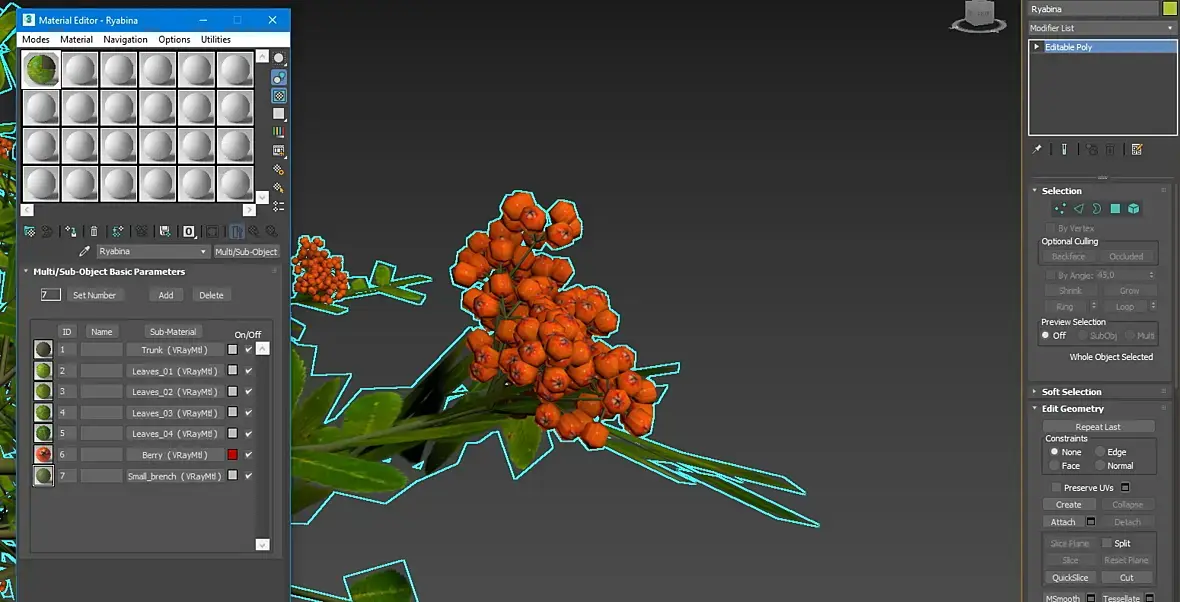 Есть такая рябина. Все объекты в ней с атачены. Выделяются только элементом. Надо удалить эти ягоды.Материалы собраны в суб объект.Можно ли как-то за раз, малой кровью, выделить эти ягоды по материалу?Макс 2022