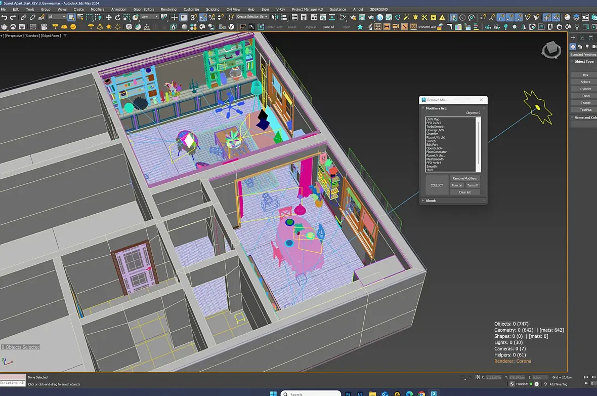 У SiNi набора скриптов есть анализатор сцены, там есть раздел с модификаторами удобный. Можно посмотреть все объекты в сцене с модификаторами и отключать или удалять их, выделять объекты и даже схлопывать стек модификаторов. SiNi свежие есть на Персии, если что.