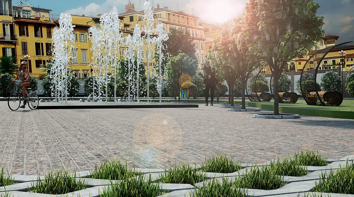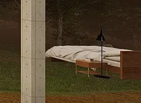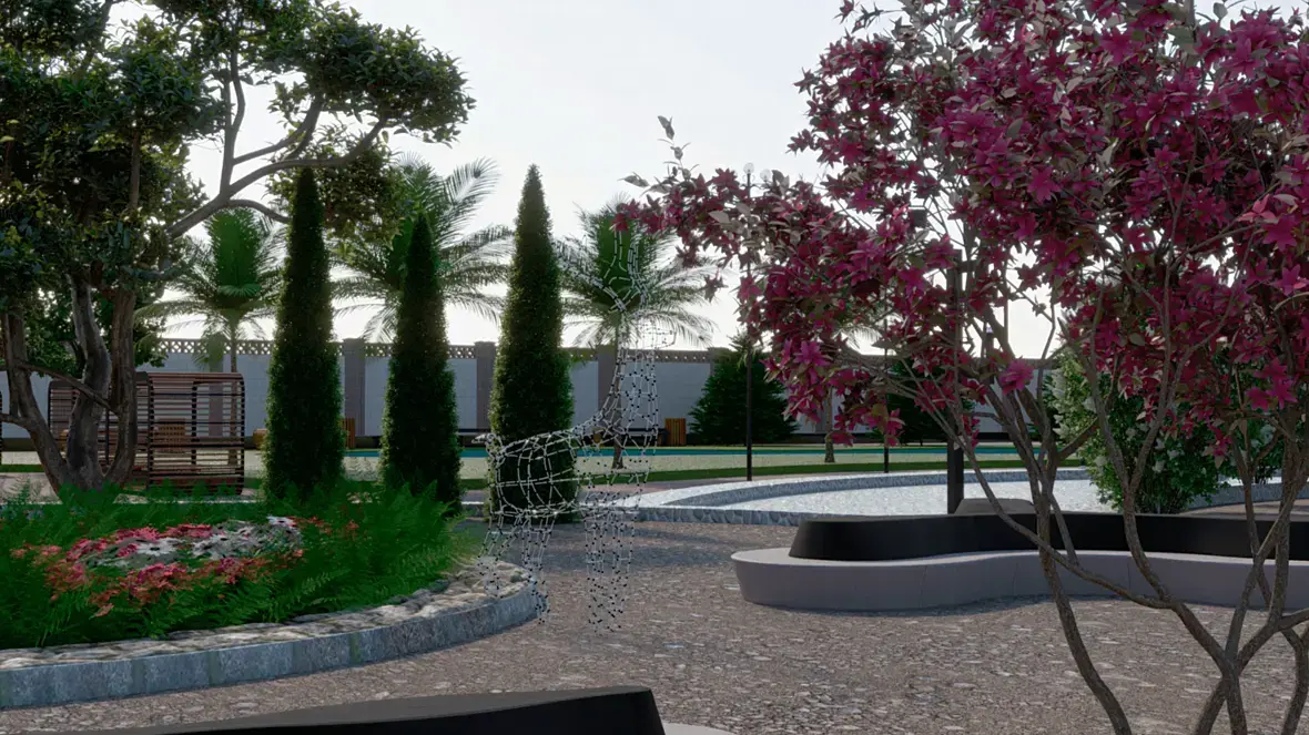 6 рендер: кровать не касается земли, как и другая мебель за гамаком. Так же в воздухе повисли тапочки, и чашки, книги у скамейки которая стоит у стены. Странное решение, поставить деревянную скамейку прямо на газон. По центру "бассейн" с диваном. Правый угол периметра не совпадает.