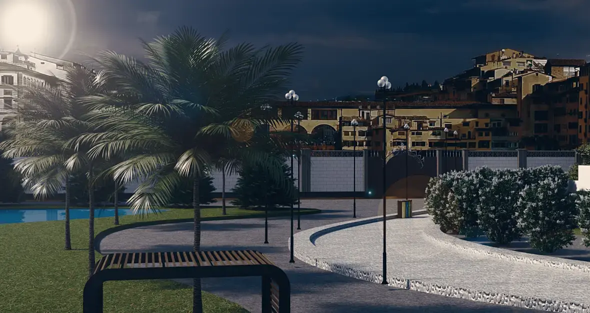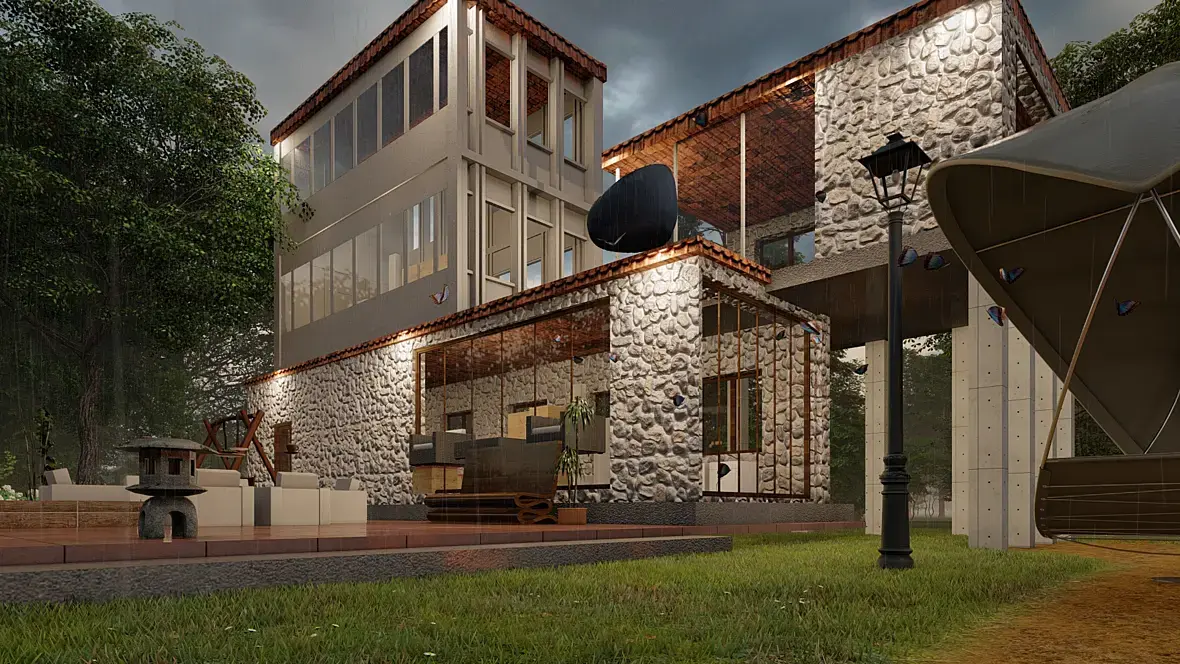 2 рендер: бабочки летающие под дождём это очень красиво. Однако немного однообразно вы их раположили (на фоне фонарного столба это видно). Непонятной формы чёрный объект на крыше. Очень оригинальное решение, сделать черепицу на потолке. Это так и должно быть? И опять в надстройке не вижу перекрытия между этажами.