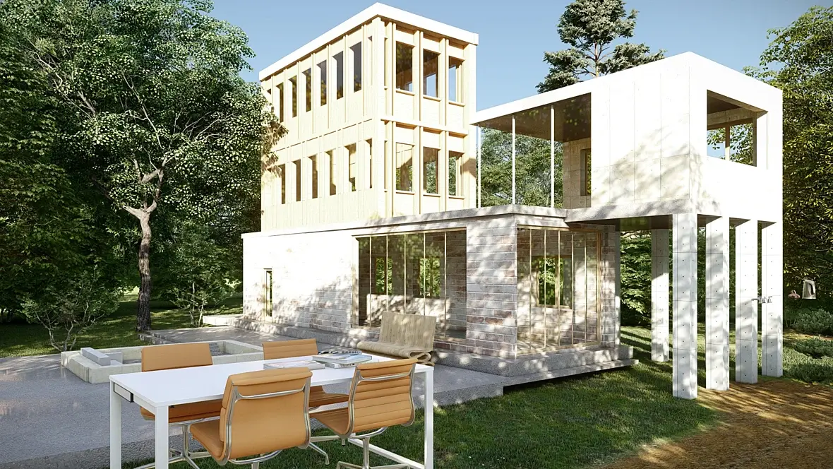5 рендер: Вот теперь я вижу, что на террасе стоит кресло. На краю... Это по проекту отсутствует перила на террасе? Интересная идея поставить кровать снаружи здания. На первом и втором этажах, вижу копии "кухни". Если на первом шкафчик может висеть на стене, то как на втором этаже этот шкафчик сможет висеть на окне? Мебель на первом этаже проткнута оконными рамами.