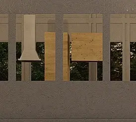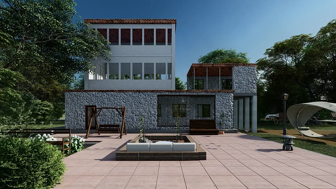 3 рендер: Практически по центру, стена протыкает черепицу. На внешних гранях стены из камней сами камни срезаны, нет ощущения, что это единая конструкция.