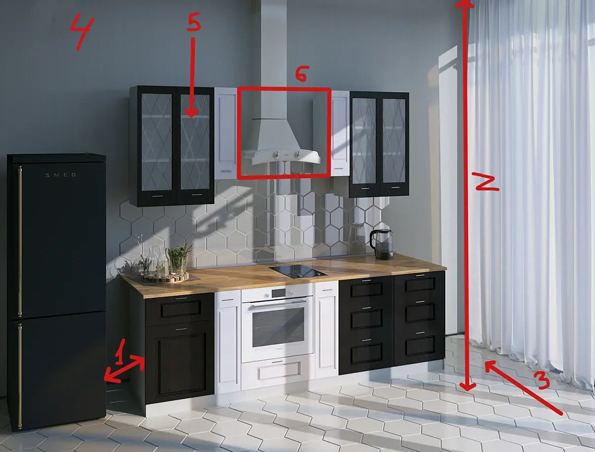 Прятать вытяжку не обязательно, но вот опустить её по низу черных шкафчиков придется, иначе от неё толку вообще не будет никакого. Швы у фартука слишком большие выглядят, я бы сделал 2-3 мм максимум, а то и 1. На полу таже история, только ещё и выступает плитка слишком сильно, сделайте на полу высоту её поменьше, в реале она чуть выступает над затиркой, на 1-2мм, а у вас там затирки даже не видно ,как щели в полу. Справа в нижнем углу кухни вылез какой-то прямоугольник на фасад кухни от плинтуса. Мойка будет?