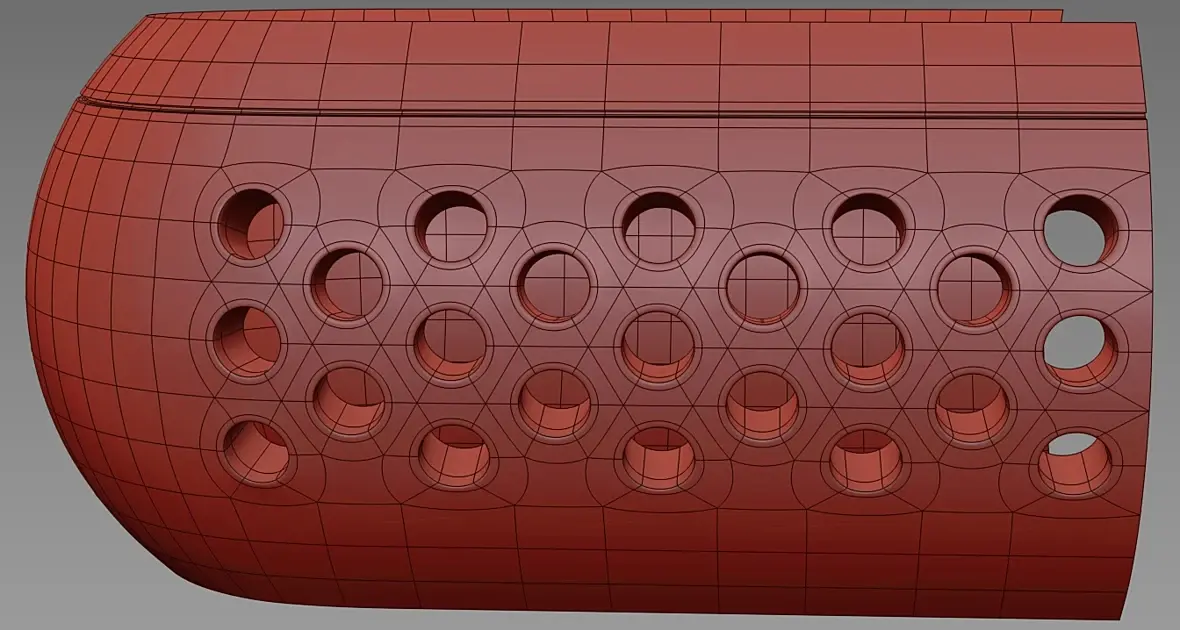Смысл-то ясен, и был ясен. Проблема в том, что эджи должны проходить через центр отверстий. Как изначально создать такую сетку, чтоб вписать отверстия, если они должны распологаться строго на определенном месте (чтоб центры отверстий совпадали с эджами)?