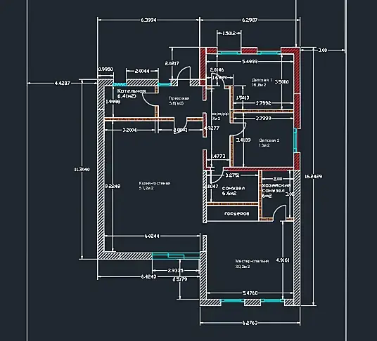 Сделайте вход в котельную с улицы. Входная зона вам спасибо скажет. Возможно, нехозяйский санузел удобнее разместить не в ядре дома, а в районе прихожей, котельной и детских. И наверное стоит указать размещение мебели и оборудования. А то вдруг досадные мелочи все испортят..
