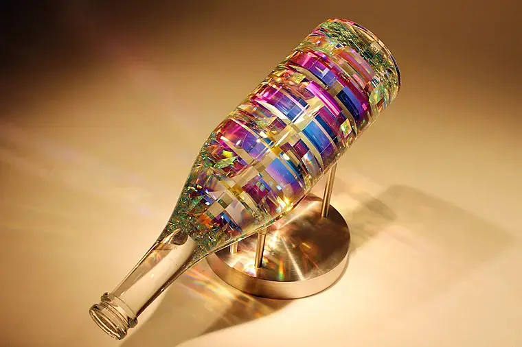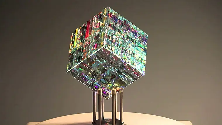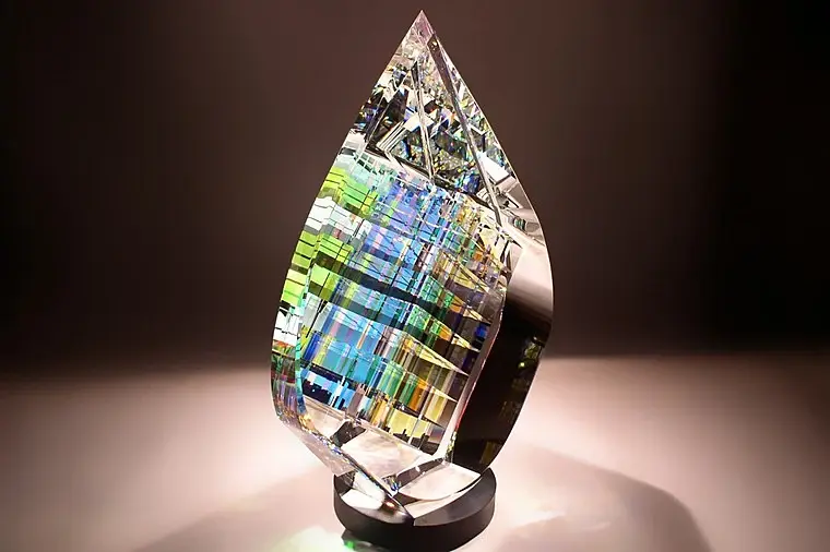 то что мне в голову приходит, это через какой-то плагин или модификатор разбить модель на осколки, а потом каждому этому осколку дать материал стекла с глубиной и градиентом разного цвето-преломления. Может получиться тоже самое