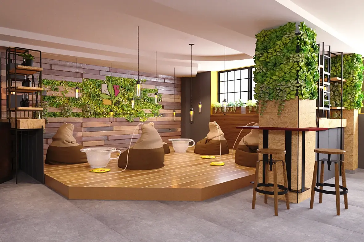 Имхо тут нужно начать с внятной расстановки посадочных мест (неважно, что там говорит заказчик, может, это его видение, но пока расстановка напоминает школьную столовую, а не уютную чайную).