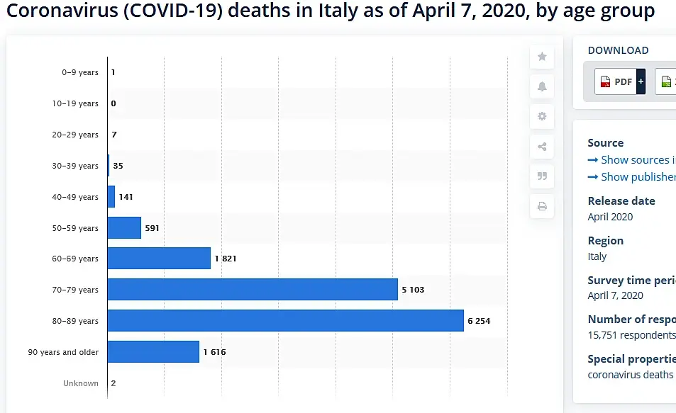 Даю вам графики. Первый возрастной состав Италии. Второй по жертвам от вируса в возрастных группах. Предлагаю вам посчитать процент смертности для каждой группы, вычислить кол-во людей в каждой возрастной группе. Умножить процент смертности на кол-во людей. Считаем половину населения то есть 30 млн