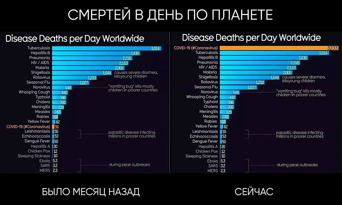 Хватит сравнивать устоявшиеся средние значения смертей от других заболеваний и пандемию с экспоненциальным ростом. Это невероятно тупо. К тому же короновирус и его последствия нужно приплюсовать к тому, что уже происходит.