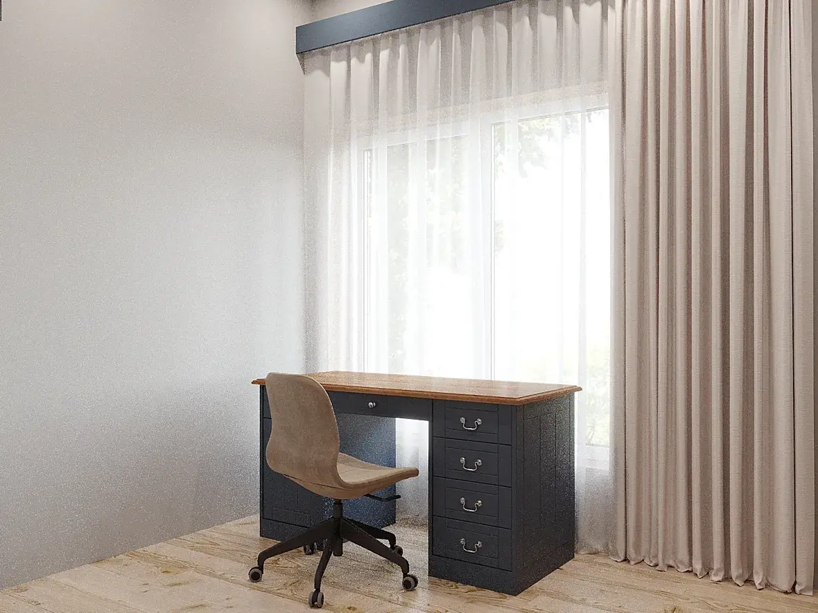 У меня плотная тюль, за ней рулонка (не блекаут), и стекло было белыми флизелиновыми обоями заклеено Ибо я люблю чтобы было светло и солнечно, но солнце в глаза это уже перебор.