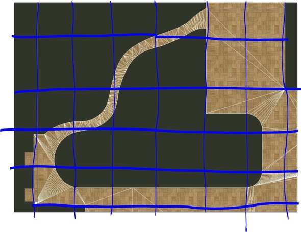 Рассматривайте это как общую логику, а не к конкретному примеру, условно сетка на которую можно разделить вашу геометрию, которая устраивает вас по плотности. Перекрестия проходят через основные элементы геометрии, в том числе и криволинейную дорожку. что бы после нарезки на квадраты можно было ее стыковать.