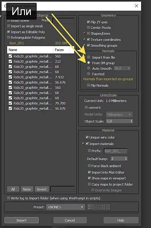 А при импорте указать, откуда брать данные о нормалях, из нормалей в файле OBJ, если их там не будет, ниже ниже будет написано, что нормалей в файле нет, тогда указать из групп сглаживания, если и их не будет, то выставить угол сглажвания вручуню или вообще без групп сглаживания (Facets)