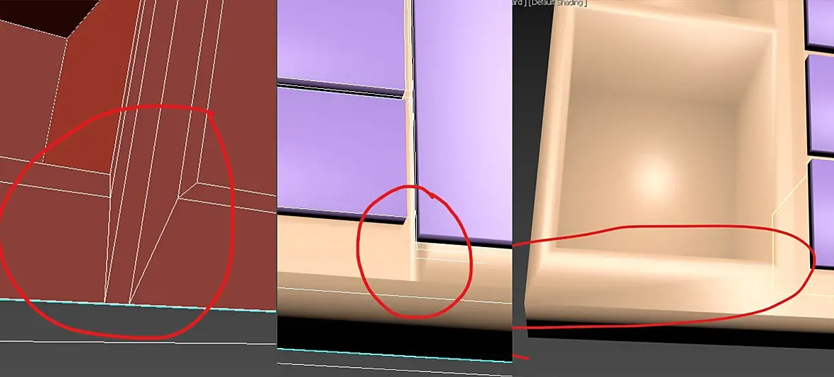 Модель, имеющая прямые углы, отображается так сглажено. Потом уже ни Smooth не помогает, ни удаление групп сглаживания, ни конверты в poly и mesh. Убирается сглаживание только удалением полигона и закрытием cap. Причем это не только проблема вьюпорта, на рендере все тоже самое.