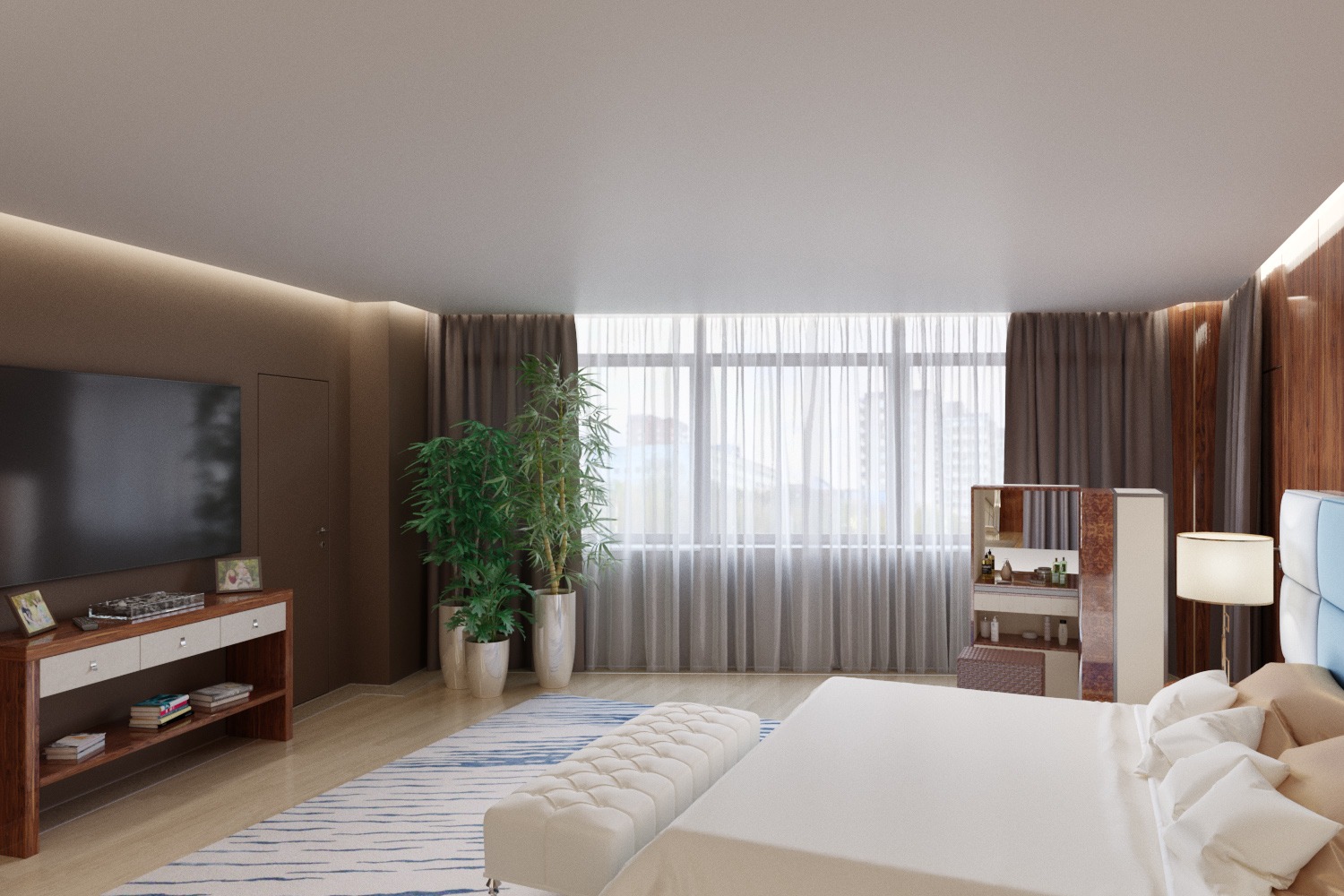 Пожалуйста помогите определиться на примере (всё, кроме банкетки у кровати и растений выполнено мной), сколько? Буду очень признателен за мнения и советы.