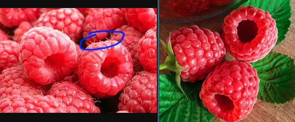 Ягода стала слишком сверкающей и прозрачной, как красная икра. Нужно сделать более мутной и матовой. Ягоды малины же налётом всегда покрыты.