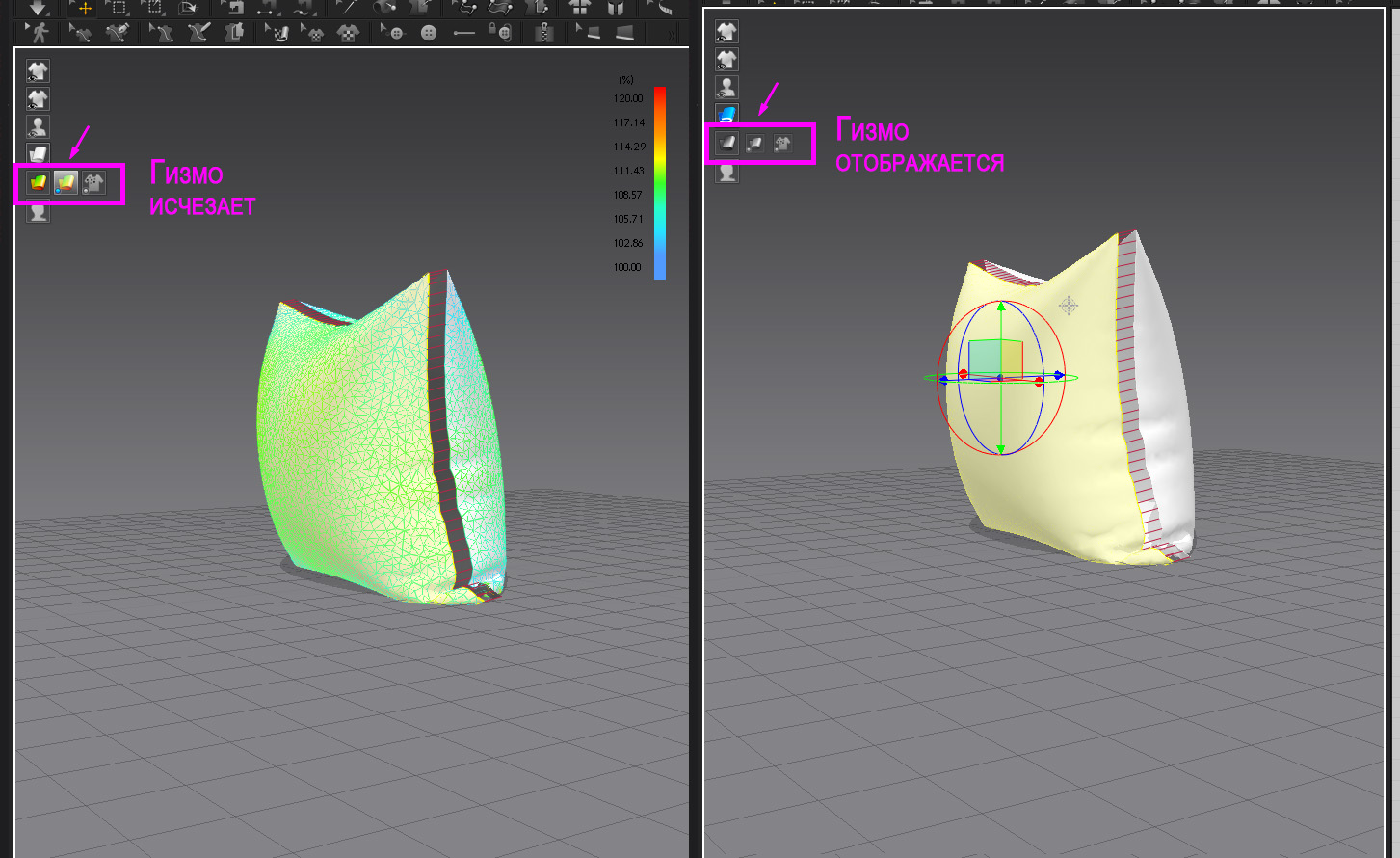Скорее всего где-то в настройках что изменил, но гизмо теперь надо включать. Перемещение и поворот отдельно, такими же кнопками как в максе. Вся ситуевина была в том, что эти кнопы реагируют только в анг. раскладке, и при запуске по умолчанию гизмо отключена. А волею судьбы на момент запуска проги раскладка стояла постоянно русская. Нажимал эти кнопки когда искал, и реакции было ноль.