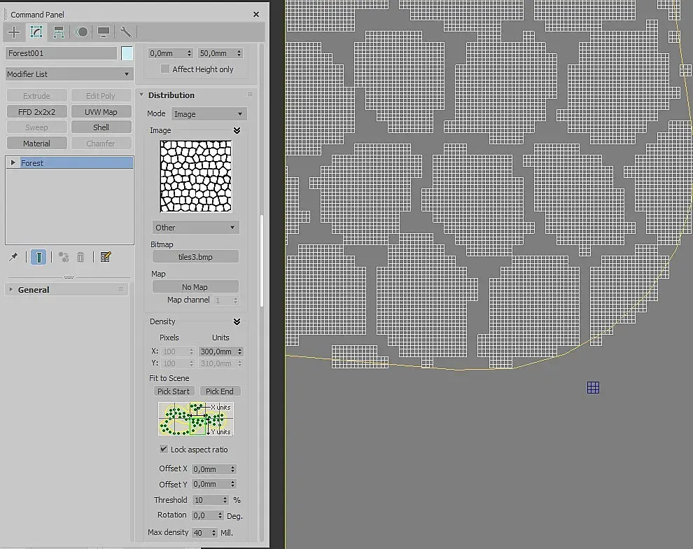 В качестве объекта для разброса прямоугольник 3 мм размером (синего цвета на скрине ниже), 3*3 полигона с разбитыми вершинами. В материале объекта в слоте Opacity карта Forest Edge. Это позволяет по краям обрезать геометрию с шагом в 1 мм. Во вьюпорте это не показывается, но на рендере режется чисто. Если нужен не рендер, а именно геометрия, то Forest Edge можно не добавлять, только тогда по краям лесенка будет размером 3 мм.