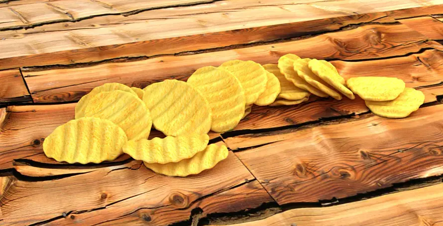 Тут дело не только в материалах - чипсины слишком идеальные и одинаковые - нет покрошившихся, надломленных, треснутых и т.п. И погнуть немного надо, они не могут быть идеально ровными - даже если картошку натереть на тёрке и сырые чипсы будут ровными, при жарке картошка всё-равно немного погнётся, чуток пойдет волнами, не совпадающими с рифлёностью от тёрки.