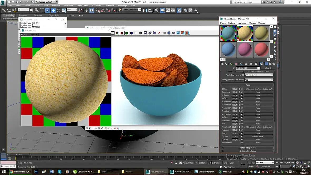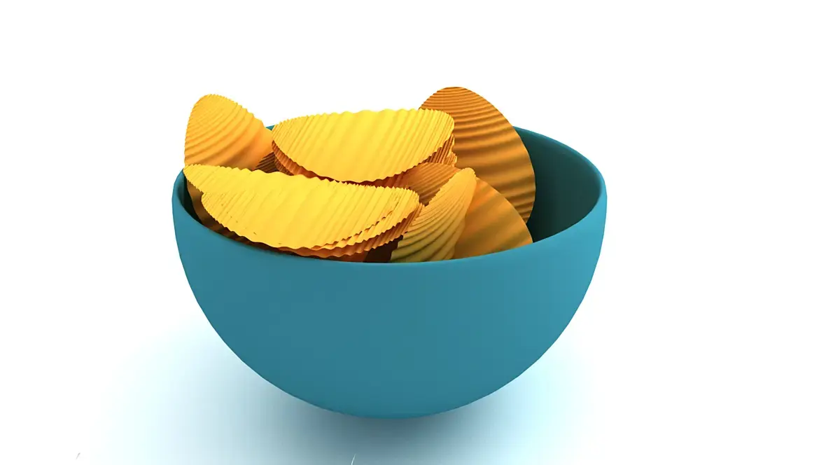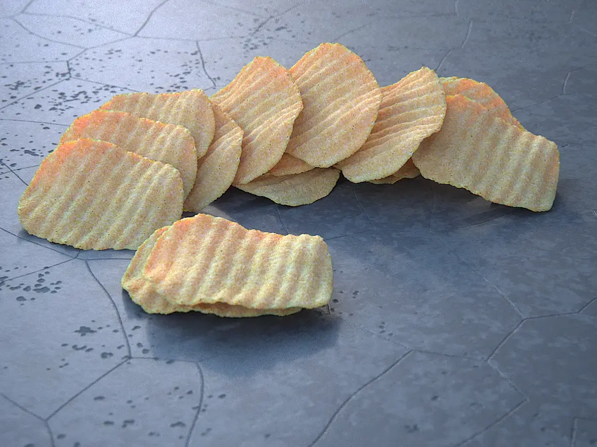 Здравствуйте. Помогите пожалуйста как визуализировать реалистичный "чипс"? У меня никак не получается реалистично, вроде нарисовал чипсы а материалы и так и сяк пробую не получается реалистично, даже если в фотошопе доработать всё равно как искусственный...