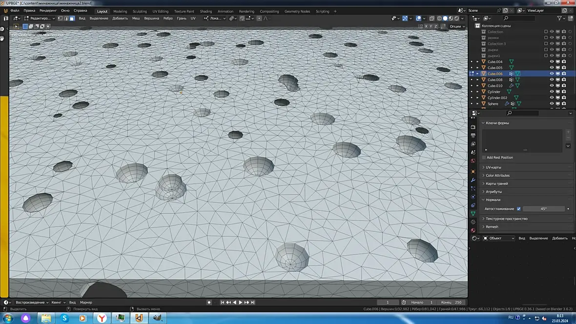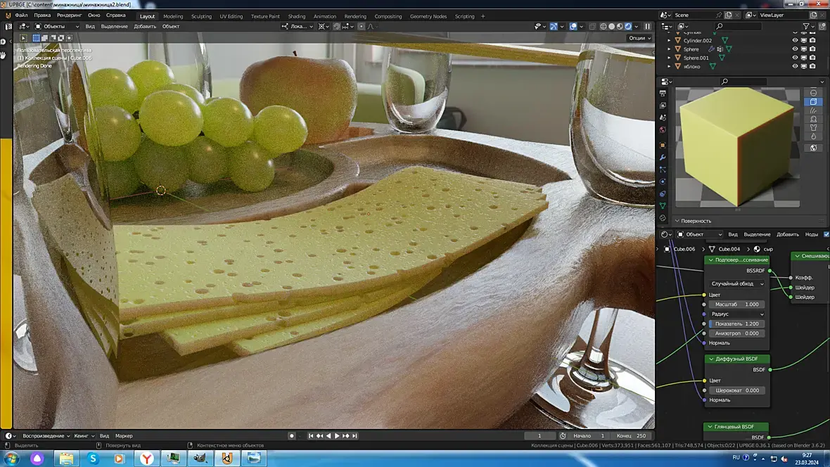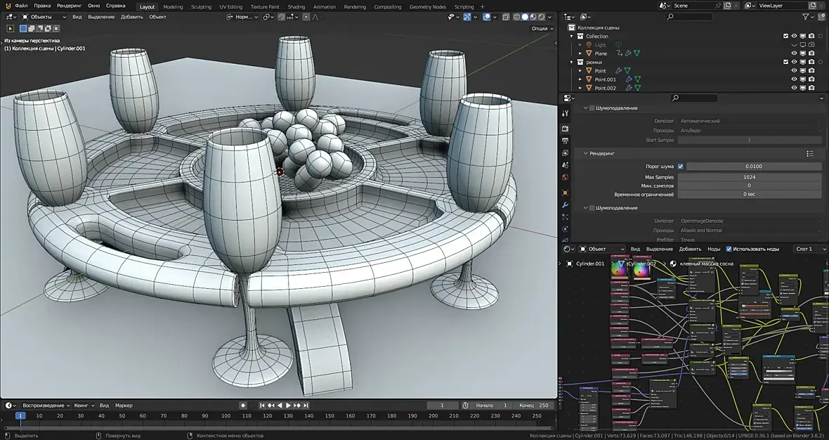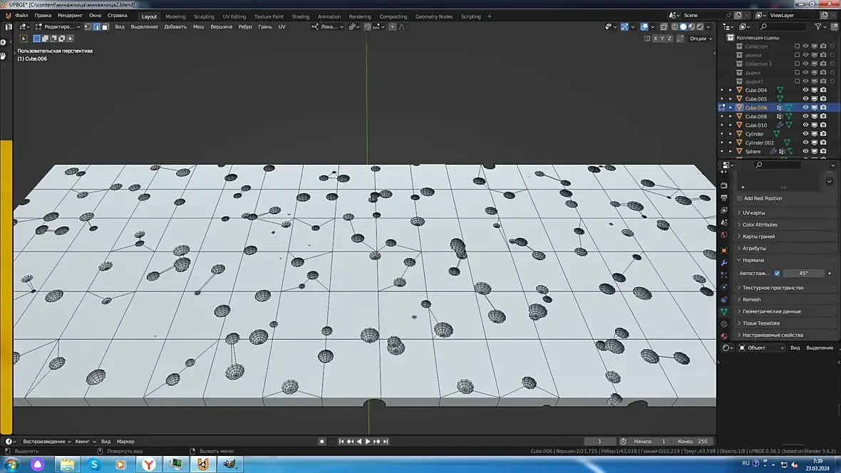 Я всегда говорил и говорю, что булевы , логические операции, для полигонального моделирования Зло с большой буквы, и применять этот модификатор следует ну если уж совсем никак. И квалификация пользователя при это должна быть уровня эксперт, чтобы потом выпрямить все косяки. По этому уже и не помню когда я его пользовал.И тут мне потребовалось положить сыр в менажницу. И вдруг обнаруживаю, что блендер может вычитать целые коллекции объектов. В общем на удивление корректный результат, триста сфер изготовленных частицами, было вычтено из подразделённого прямоугольника. И только в одном месте я руками поправил один кривой n-гон.
