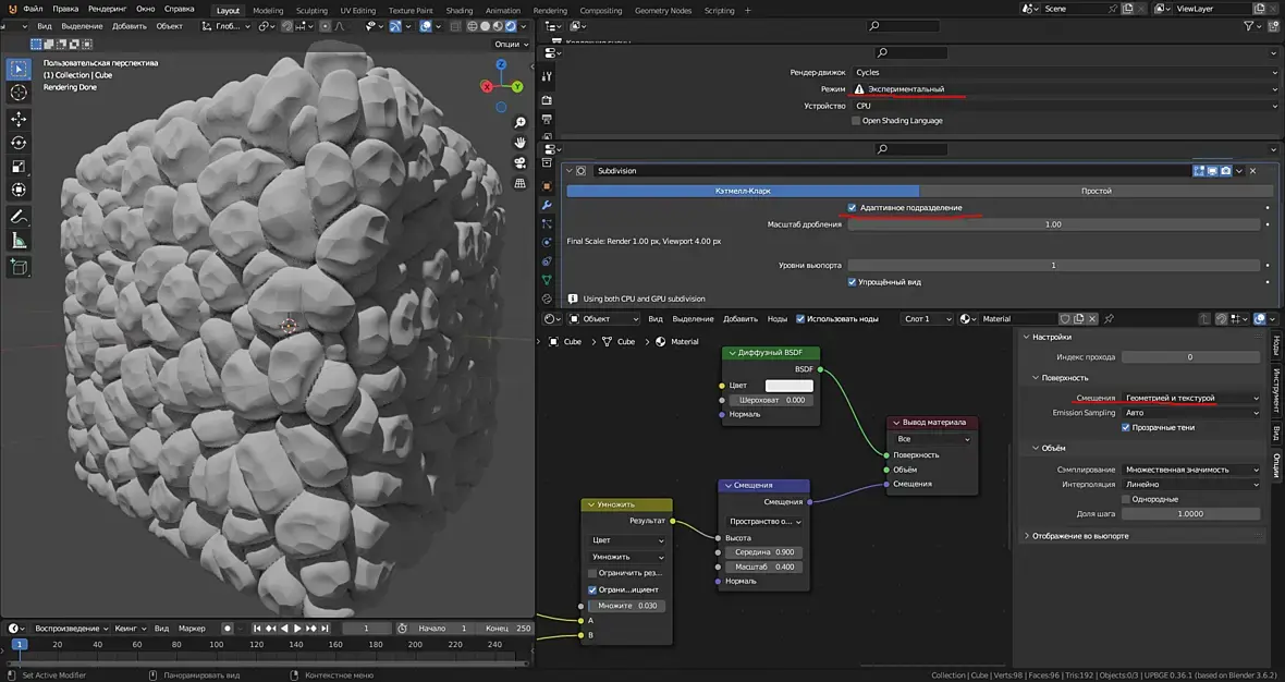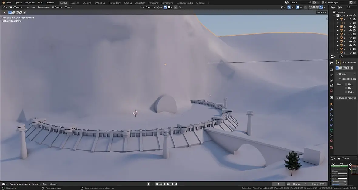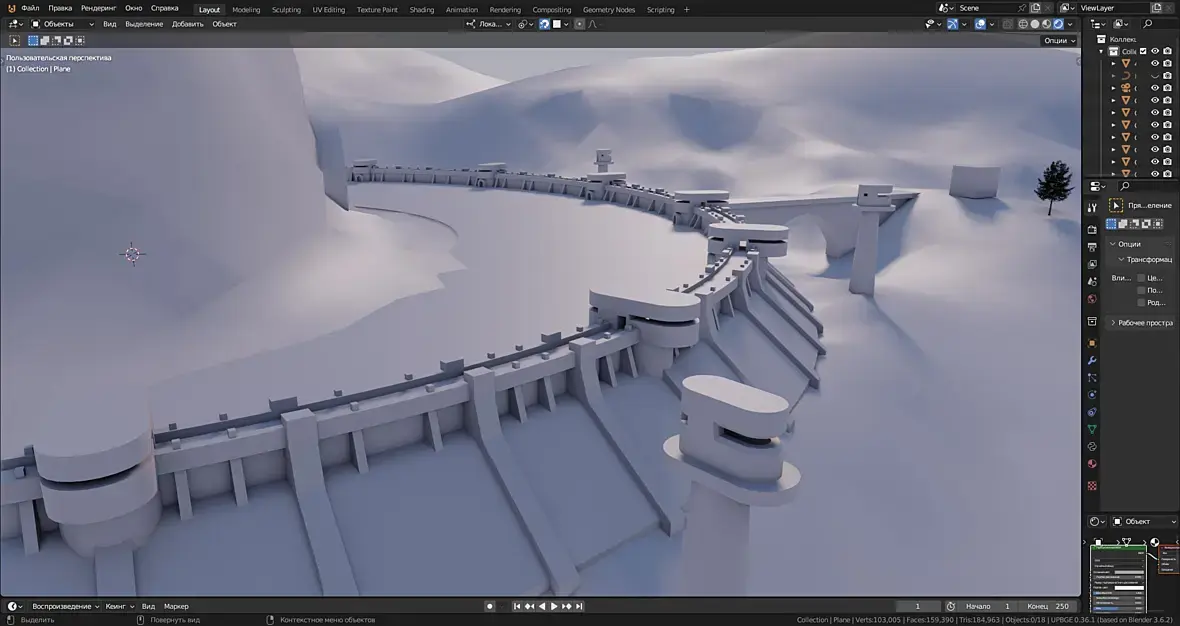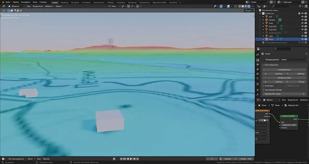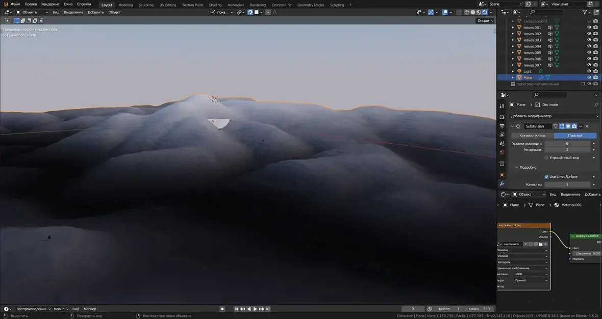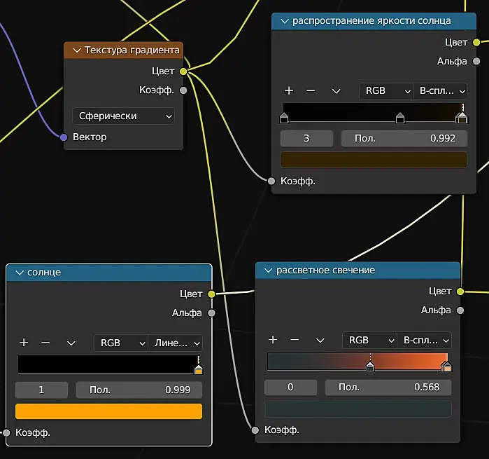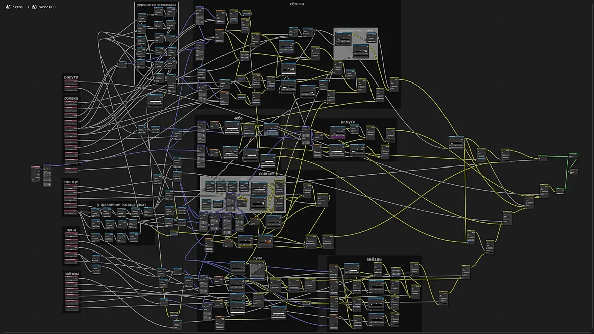 И это всё работает неровно, нестабильно, то там засвет, то там прожигание, Нет проблемы настроить одиночный кадр, но вот солнце заходит за тучу, и на облаках чёрное пятно от солнца, и я уже не помню, какой именно нодой я делал это затенение, чтоб солнце не просвечивало сквозь тучи, надо искать...