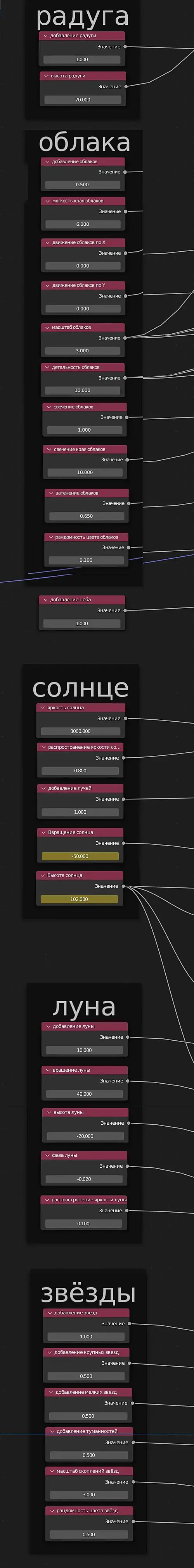 Процедурная текстура неба, для блендер, это текстура окружения, замена HDRI.Не нуждается в геометрии или растровых текстурах.Состоит из генераторов солнца, неба, облаков, звёзд, луны, и радуги.Помимо этого есть группа нодов управления восход-закат, и группа нодов управления светотенью на облаках.Текстура имеет следующие настройки.