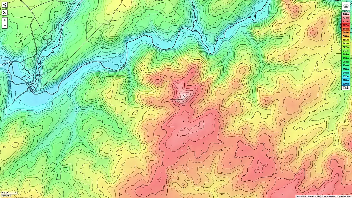 В общем по теме, достоверных фоток этого места не нашел, но само место видимо реально существует. Только согласно данных карт, Медвежья хоть и является господствующей высотой, на эпичную сопку не тянет, и в целом рельеф конечно холмистый но не скалистый.