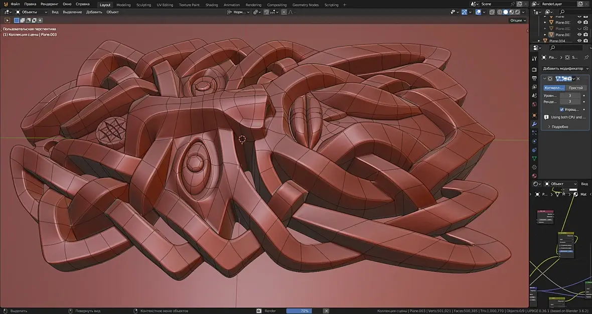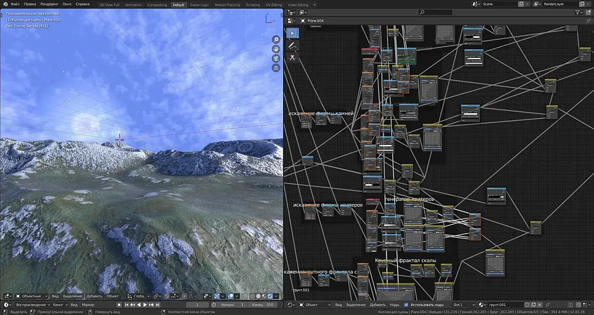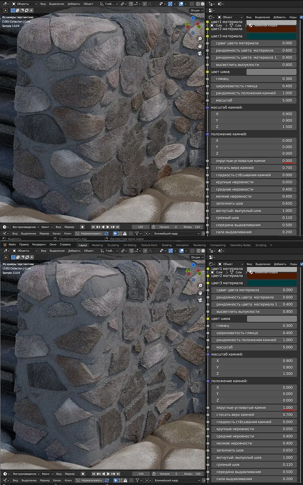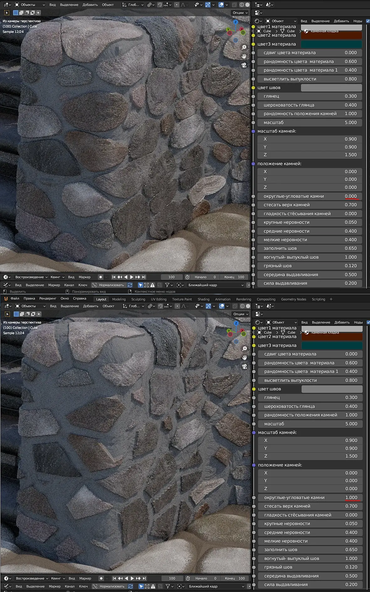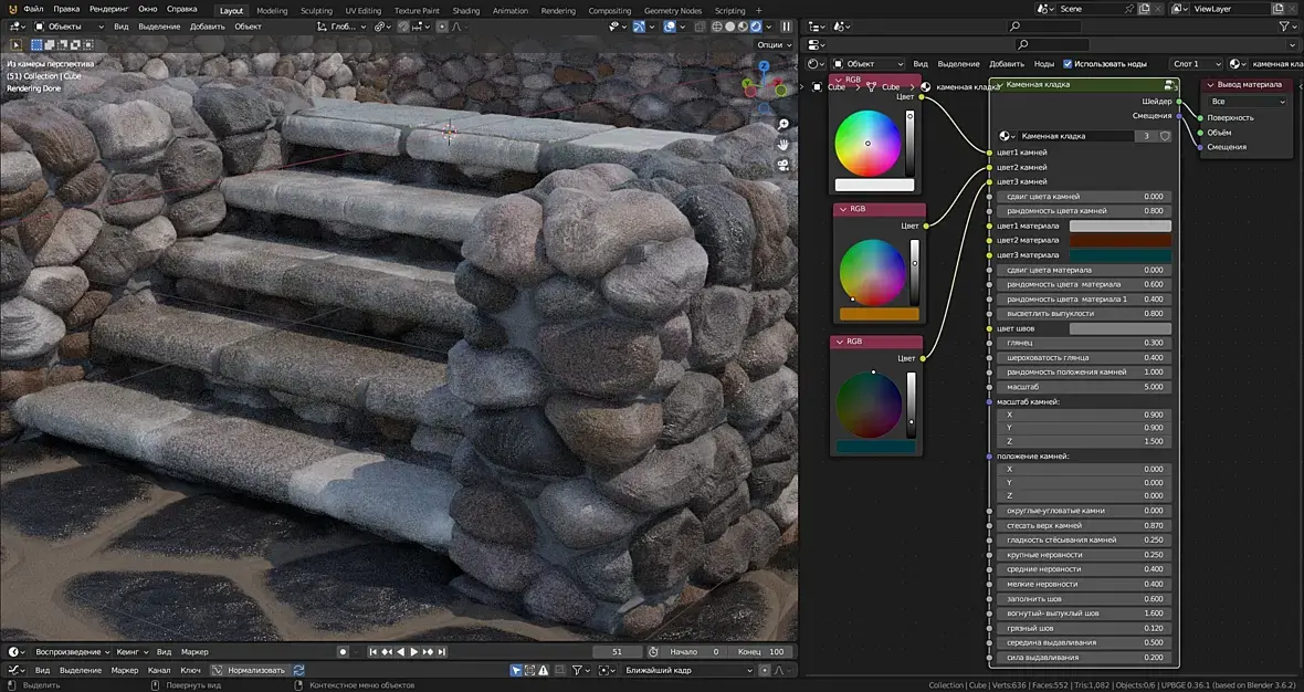 Ну и в силу всего этого материал получился тяжёлый в расчётах. Однако надеюсь что оно того стоит.Вы можете попробовать использовать и Еву (Eevee) но тут я ничего не гарантирую, хотя в последних версиях вроде бы добавлена возможность адаптивного подразделения для евы, скорее всего подразделение геометрии придётся отключить, и это будет уже совсем не тот эффект.Теперь подробнее о настройках материала:Три цвета камней, создают градиент из которого случайным образом выбирается цвет каждого отдельного камня.Сдвиг цвета камней, определяет камней какого цвета больше, первого или третьего.Рандомность цвета камней, если 0 то усреднённый цвет, 1 цветные камни.Три цвета материала создают градиент из которого случайным образом выбирается цвет вкраплений в материале камней.Сдвиг цвета материала, и Рандомность цвета материала, работают точно также как Сдвиг цвета камней и Рандомность цвета камней, но только не для отдельных камней, а на уровне мелких вкраплений в материале камня.Рандомность цвета материала 1, добавляет цветного шума к цвету материала в целом.Рандомность положения камней, 0 клетка, 1 случайная геометрия.Масштаб, это общий масштаб материала.Масштаб камней, определяет только размер камней по трём осям. Масштаб же неровностей и цветных вкраплений в материал остаются неизменными.Округлые угловатые камни, определяет форму камней, округлые камни больше оставляют места для раствора в углах, угловатые ложатся плотнее.Стесать верх камней, ровняет камни по стене, стёсывает сильно выступающие части камней.Гладкость стёсывания камней, сглаживает это стёсывание.Заполнить шов, заполняет расстояние между камнями раствором. Осторожно, можно залить всё. и камней не будет видно))).Вогнутый-выпуклый шов, определяет геометрию раствора заполняющего расстояние между камнями, 1 ровно.Грязный шов, пачкает раствором камни около шва.