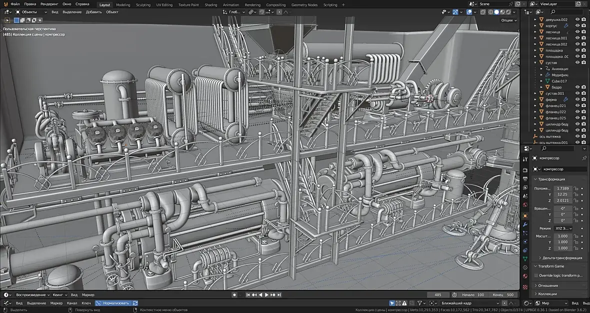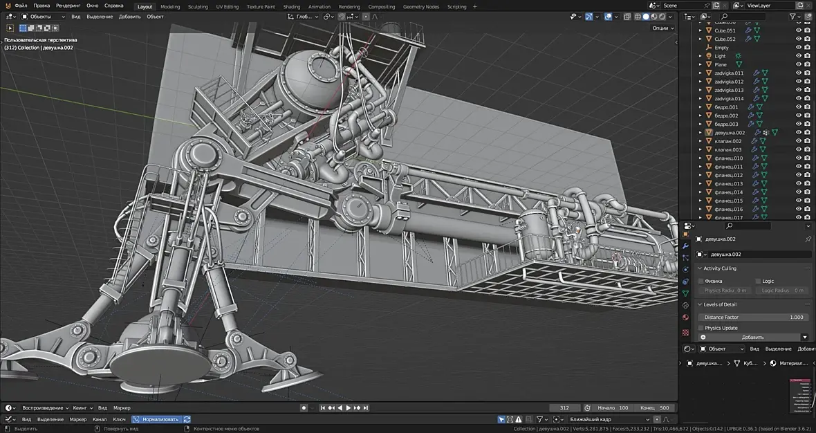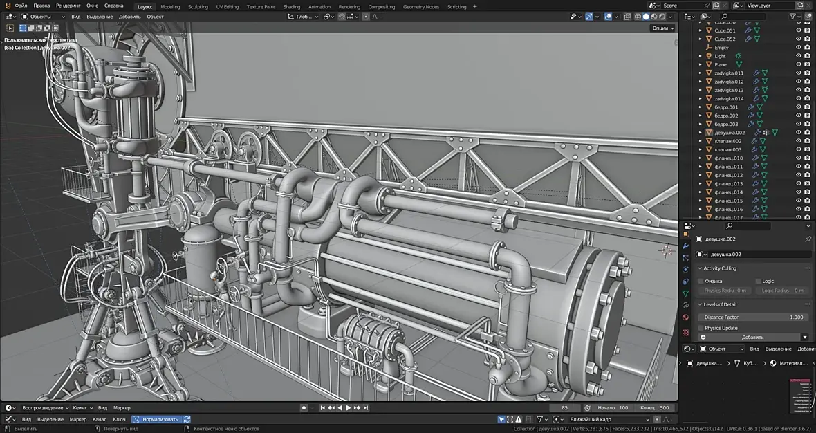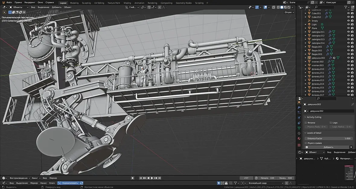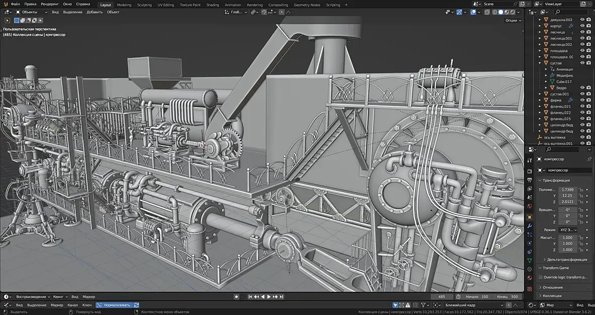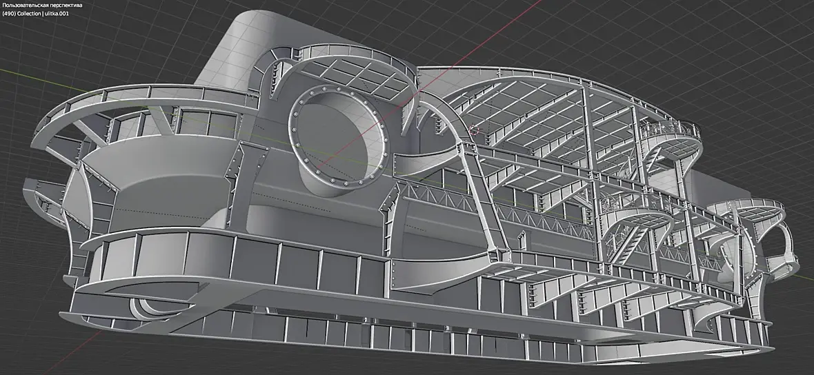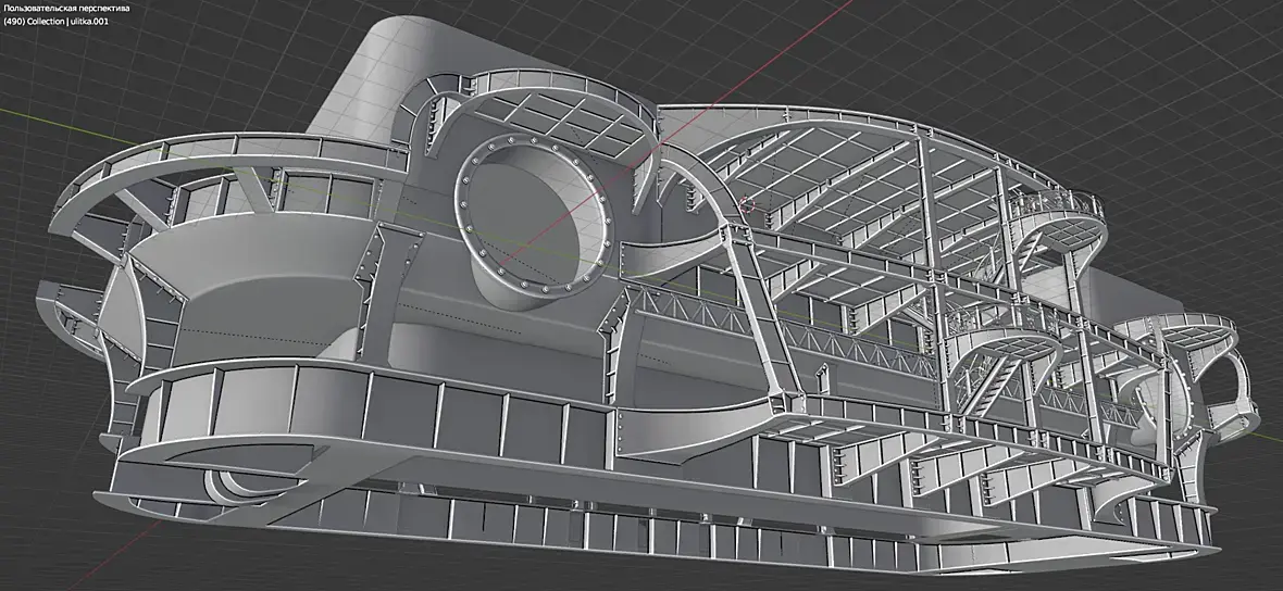 В общем, есть недоработкинестыковки. мелкие правки, но в целом основная часть механики левого борта собрана, Правая часть будет во многом зеркальна. так что механика подходит к концу. Правда электро генератор ещё где то тут должен быть.. И начнётся архитектура. Какое то время наверное придётся потратить на оптимизацию геометрии, любовь к моделированию под сабдивижен привела к 20 миллионам треугольников, а это ещё даже не четверть от запланированного, и это не считая окружения.