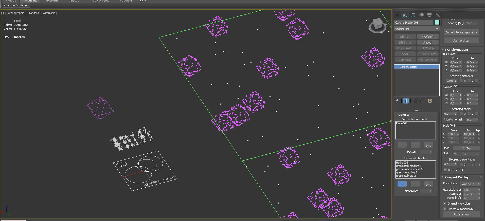 Здравствуйте, прошу помочь разобраться. Почему то пытаюсь использовать Corona Scatter для размножения моделей травы, но не получается. Другие объекты размножает а траву не хочет. Не понимаю почему. И главное точками показывает где эта трава располагаться должна, но самих моделек там нет. Не понимаю в чем проблема.