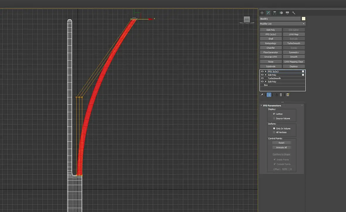 там и ровный можно без минусов искажения геометрии как у ФФД - просто уменьшаешь расстояние лимит эффекта и палка ровно гнётся у корня изгиба
